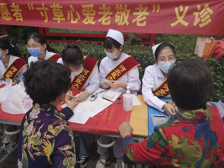 青年志愿者服务队一行10余人走进荣景园社区,来到老人身边,现场提供健康咨询,免费测量血压、血糖,为社区老人们送去节日的祝福。