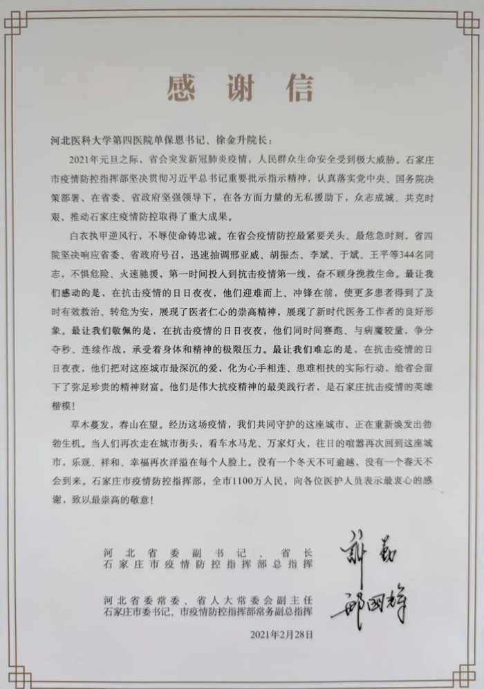 单保恩书记表示,医院加强党建引领,提高站位,强化了疫情防控执行力。院党委发出《关于在疫情防控工作中充分发挥党支部战斗堡垒作用和党员先锋模范作用的倡议》,第一时间印发文件,各路医疗队及本部、东院发热门诊都建立了临时党支部,其中援胸科医院临时党支部是所有援助队伍中最早成立的党支部。55人在一线递交了入党申请书。院党委向抗疫一线职工发出慰问信,成立了党员抗疫志愿服务队,为120余人次的抗疫一线人员及家属送去了亟需的用品和慰问品。医院通过官微与网站发布宣传报道百余篇,点击量30万以上。人民日报、光明日报、央视新闻、学习强国平台、人民网、新华网、河北日报等众多媒体,相继刊登、转发果冻传媒