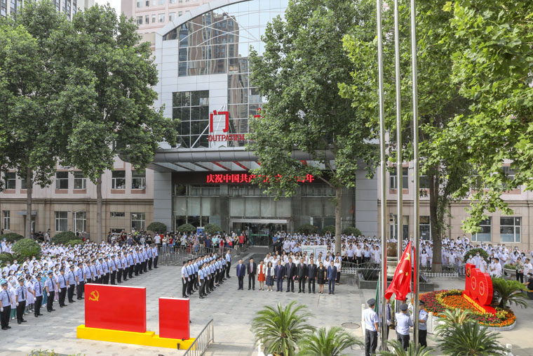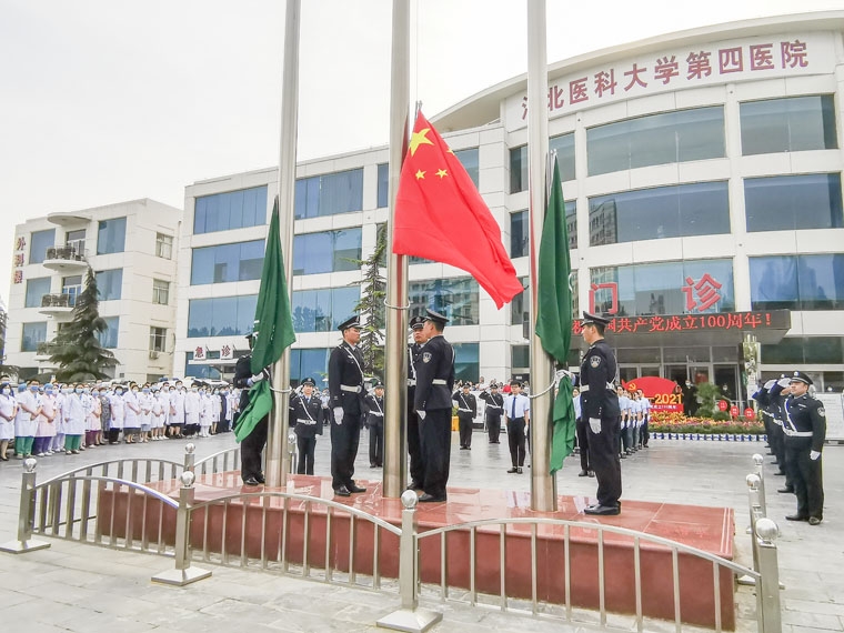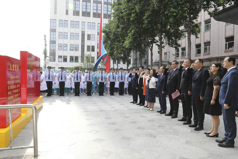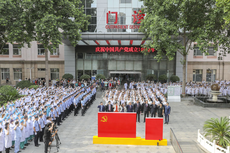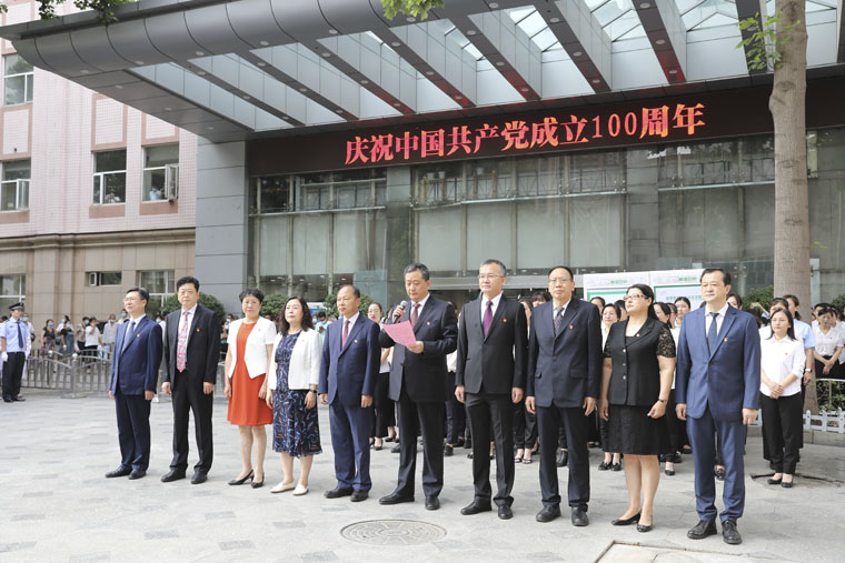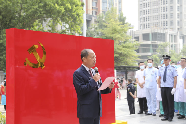 党委书记单保恩发表讲话,他指出,在中国共产党成立100周年之际,医院党员干部职工举行升国旗、升院旗仪式,新党员入党宣誓,老党员重温入党誓词,隆重庆祝党的百年华诞,这是回顾党的丰功伟绩、砥砺初心共创辉煌的重大活动。他表示,一百年来,中国共产党以马克思主义为行动指南,团结带领全国各族人民前仆后继、顽强拼搏,建立起新中国;进行社会主义革命和建设,成功开辟中国特色社会主义道路,在习近平新时代中国特色社会主义思想指导下,为中华民族伟大复兴打开了前所未有的光明前景。建党百年之时,站在“两个一百年”的历史交汇点,在党的领导下,我们比历史上任何时期都更接近、更有信心和能力,实现中华民族的伟大复兴!