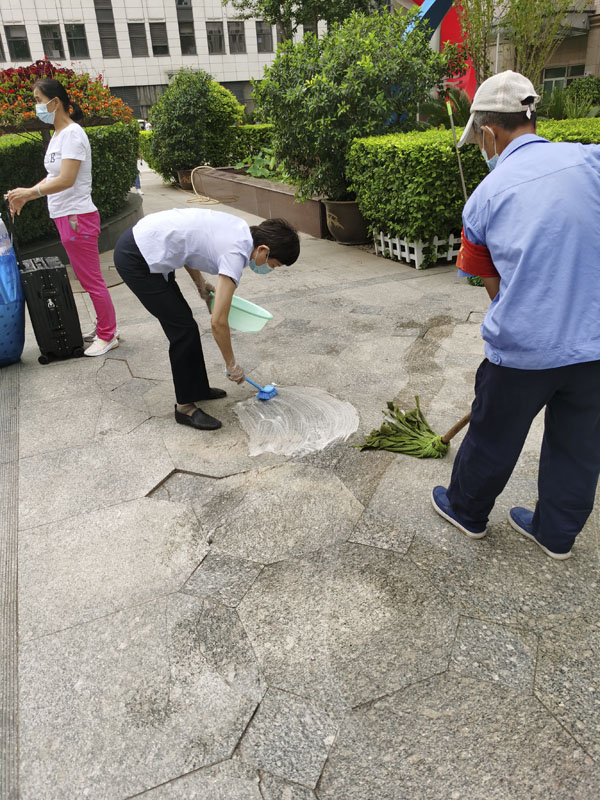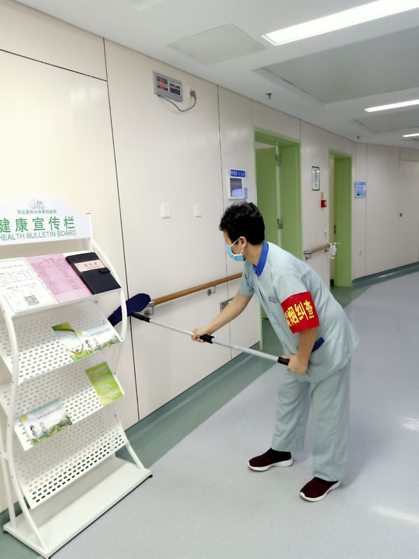 环卫班在6月份面向全院开展卫生大扫除活动,对室内的门诊、病房楼道、卫生间,室外的走廊、各绿化带和楼顶平台等系统集中清理,不留死角。