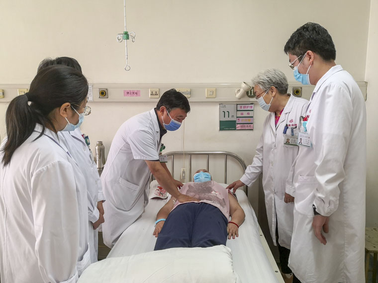 妇瘤科收治的宫颈癌大出血患者在接受止血治疗时因突发肺栓塞发生晕厥、意识丧失,一度出现心脏骤停。妇瘤科医护人员面对险境冷静处理,并与麻醉科、重症医学科、急诊科医务人员集中会诊,在大家近1个小时的不懈努力下,患者终于恢复自主呼吸能力,目前已转至当地医院继续接受治疗。
