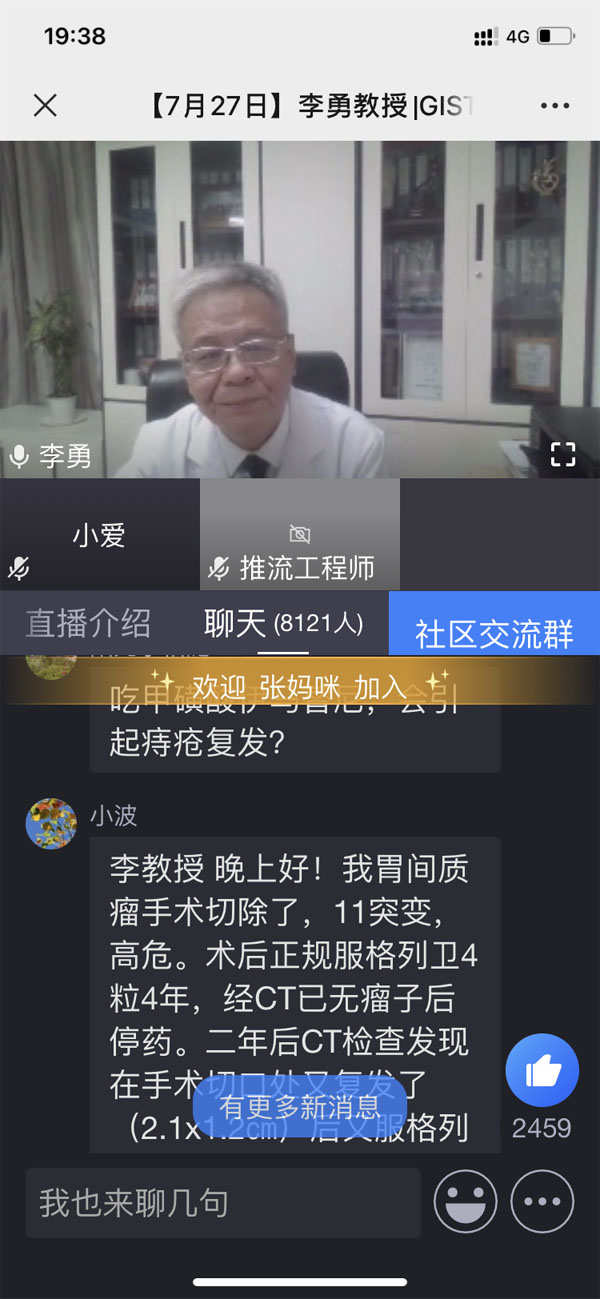 李勇教授对手术治疗、靶向药物治疗过程中的注意事项进行了详细介绍并就靶向药物治疗随访复查的重要性及随访复查的间隔及方法进行了讲解。他全面详细地诠释了GIST全程管理,在主题讲解结束后,李勇教授就 “GIST是否需要进行基因检测、术后是否需要服用靶向药物、服用靶向药物需持续几年”等患者关心的问题进行了在线答疑。