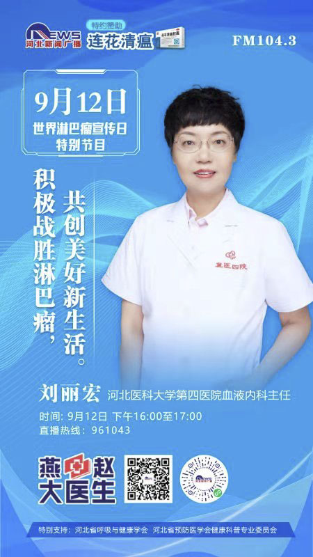 9月12日,血液内科刘丽宏主任做客河北综合广播《燕赵大医生》栏目为广大听众朋友普及淋巴瘤知识,收获普遍好评。9月13日,血液内科在东院区门诊大厅举办了“世界淋巴瘤日”义诊及宣教活动。义诊专家由果冻传媒
