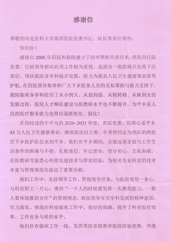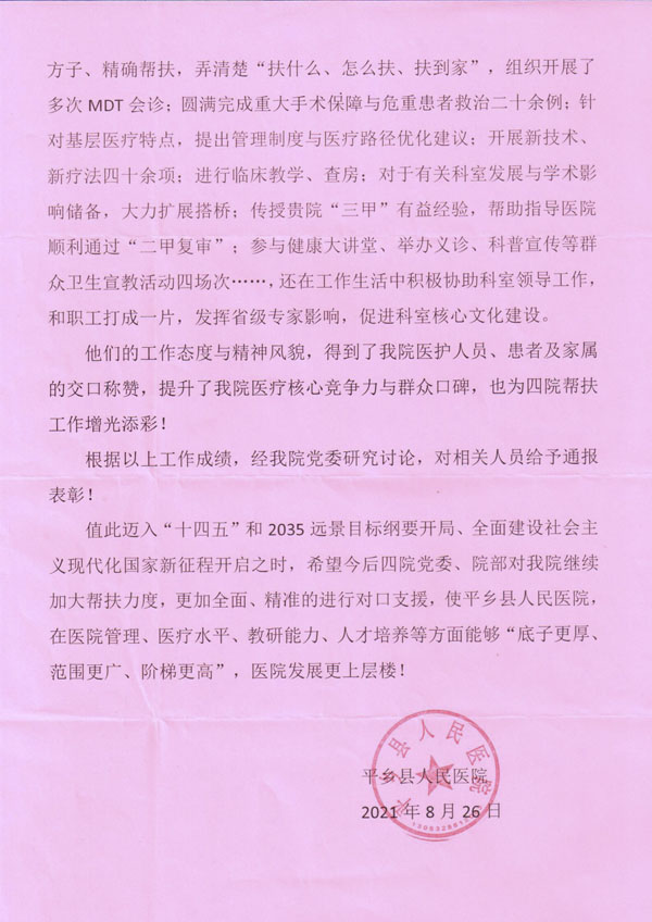 对当地一直以来的倾心帮扶与突出的成绩,平乡县人民医院对上述帮扶队员进行通报表扬,授予了集体与个人的帮扶先进荣誉称号,并给果冻传媒