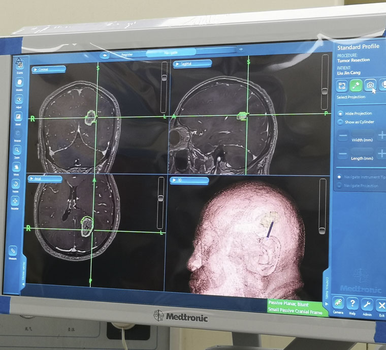 就诊。患者症状重且病情进展快,头颅MRI检查显示左颞枕脑深部病变,强化明显,考虑为恶性转移瘤或恶性胶质瘤可能性大,且可能因严重高颅压出现脑疝死亡,张学新主任决定尽快安排手术。由于患者肿瘤位于大脑皮层功能区深部,附近有重要的神经纤维束穿行,如果定位不准确,易造成正常脑皮层损伤,有永久性偏瘫的风险。为提高术后患者生活质量,经神经外科、麻醉科、手术室会诊后,决定在原有手术方法的基础上结合神经导航技术,为患者实施“精准治疗”,即神经导航辅助下脑深部肿瘤切除手术。
