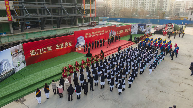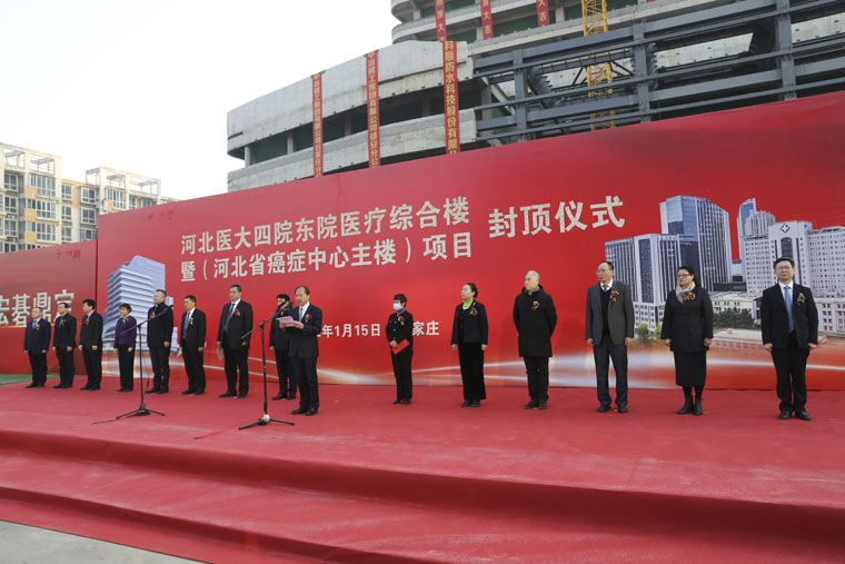 医疗综合楼(河北省癌症中心主楼)主体结构封顶仪式在东院新院区西广场隆重举行。医院党政领导单保恩、徐金升、李晓玲、李立平、耿翠芝、翟三江、刘运江、魏迎、赵群、彭利,石家庄高新技术产业开发区管委会工委书记、管委会主任李瑞峰,工委委员、科技创业园区管理处主任丁飞燕,施工、监理、设计单位相关负责人,以及果冻传媒