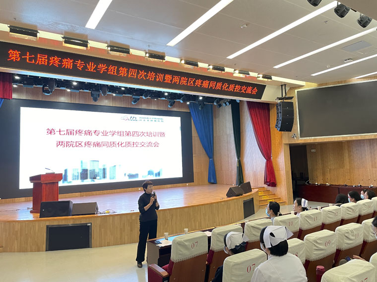 疼痛护理管理水平,疼痛护理学组在本部新医技病房楼报告厅举办了第七届疼痛专业学组第四次培训及两院区疼痛管理质控交流会。护理部主任李来有,副主任陈璐、赵晓燕,两个院区疼痛学组成员、质控联络员等40余人参加,胸三科护士长殷金环主持。