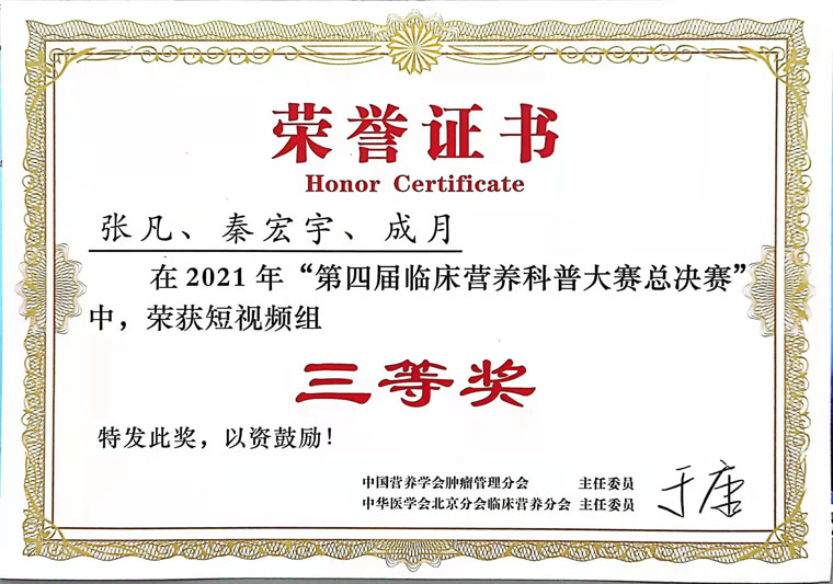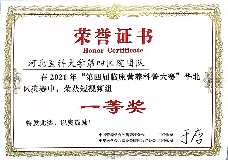 为展现临床营养师的工作风采,科室成员积极参加、筹备多项营养赛事,喜获佳绩。在中国营养学会肿瘤营养管理分会主办的“第四届临床营养科普大赛”中,临床营养科《“热爱”营养的她》科普视频作品获河北赛区一等奖、华北赛区一等奖、全国总决赛三等奖。科普作品《有超级防癌食物吗》获2021年度河北省健康科普作品征集大赛图文类三等奖。为响应“全民营养周”及“5.11防治肥胖症及其并发症”的活动号召,科室举办减脂大赛,深入落实“健康中国”行动营养健康任务要求。