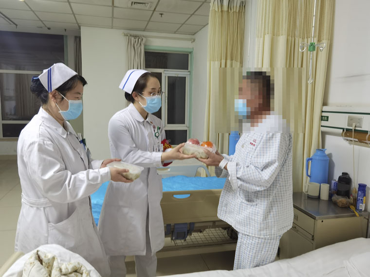 除夕夜,东院口泌病区值班人员为在院患者及家属送去了饺子和水果,护士长连续几年主动担除夕夜值班任务。