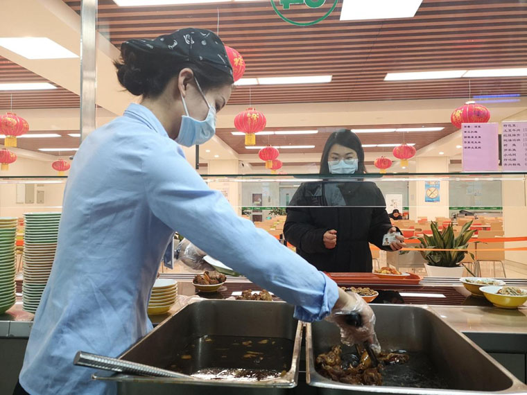 春节期间,膳食部人员保障在院职工的用餐需求,在餐厅悬挂红灯笼,营造节日氛围。