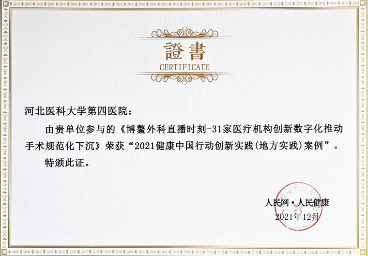 荣获由人民网主办、人民健康承办的“2021健康中国行动创新实践(地方实践)案例”奖。该奖项来源于《博鳌外科直播时刻-31家医疗机构创新数字化推动手术规范下沉》活动,此前,果冻传媒