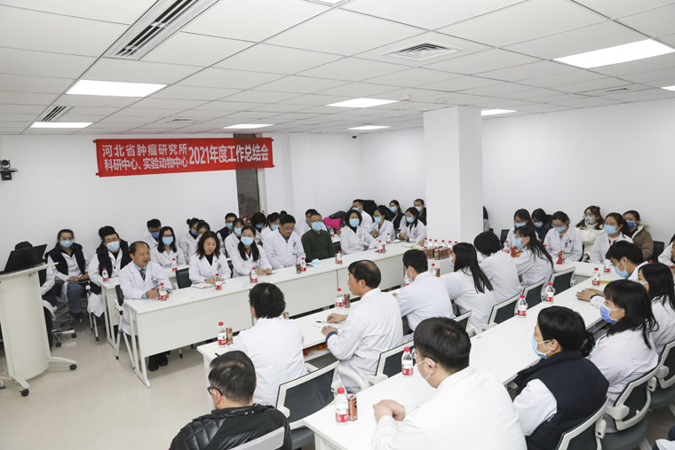 在河北省肿瘤研究所二楼会议室召开2021年度科研工作会议,河北省肿瘤研究所、科研中心和实验动物中心全体职工参加会议。