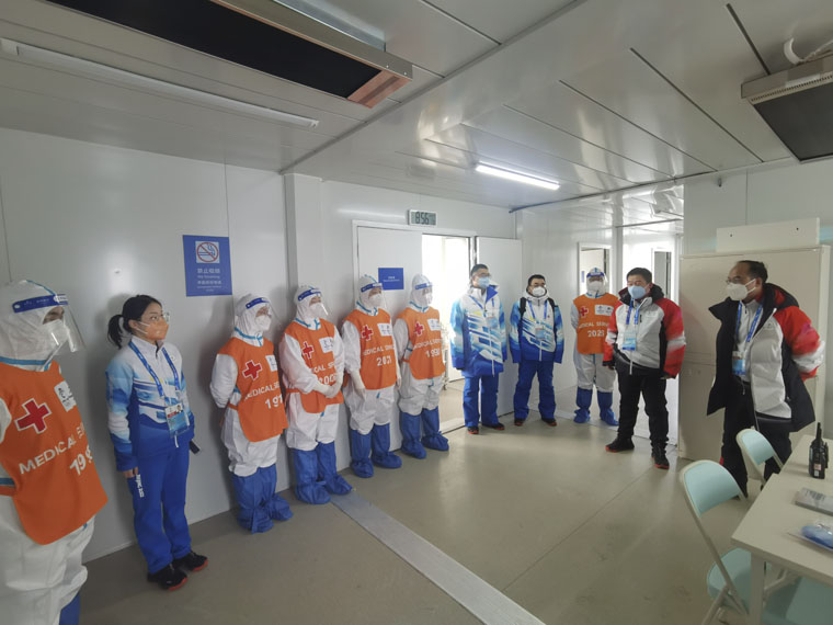 负责的医疗站进行考察,专家们赞扬医疗站的准备工作做到了“在细节之处见真章”,队员们听闻都备受鼓舞。两位医疗官表示,我们会和大家在工作中继续反复推敲每个诊疗细节,发扬四院精神、贡献四院智慧,众志成城,不负重托,推动各项工作取得更大成效,保障高标准、高质量完成冬奥会及冬残奥会的医疗保障服务。
