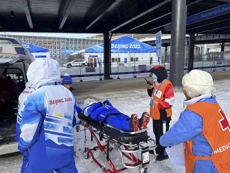 冬奥医疗保障的队员们3次奔赴张家口崇礼区、石家庄西部长青滑雪场进行实地探勘和演练,并邀请院感专家、药学专家进行现场指导。演练按照实战情况以不同场景开展,分别模拟了运动员颈椎损伤、观众猝死等突发情况。队员们在标准防护下完成快速到达、快速处理、快速转运的全流线、全过程操作。演练结束后,大家结合实际演练效果、防疫重点环节和亟需进一步完善的工作重点进行了讨论与总结,很大程度上提升了个人防护意识、救治水平和应急处置能力,为进一步优化医疗保障方案提供了良好的参考依据,也让两位医疗官信心倍增。