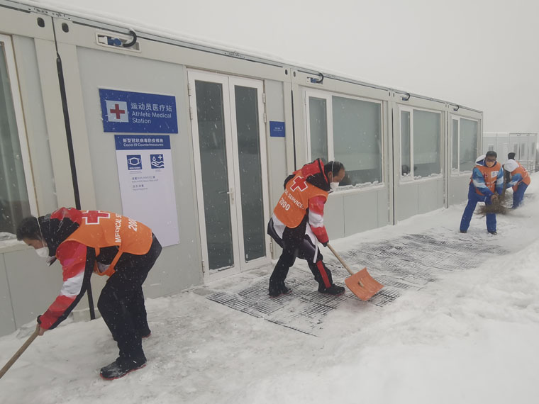新冠疫情使得本次赛事无法借鉴之前的医疗保障工作经验,一切从零开始。2021年11月初,何宏涛副院长和赵孝先处长提前3个月来到崇礼,与北医三院的李明昊医疗助理合作,紧密开展各项协调筹备工作,包括与相关业务领域对接、制定制度保障方案、准备医疗站点物资、确定冬奥医疗保障队每位队员的医疗岗位,远程指导培训演练等。