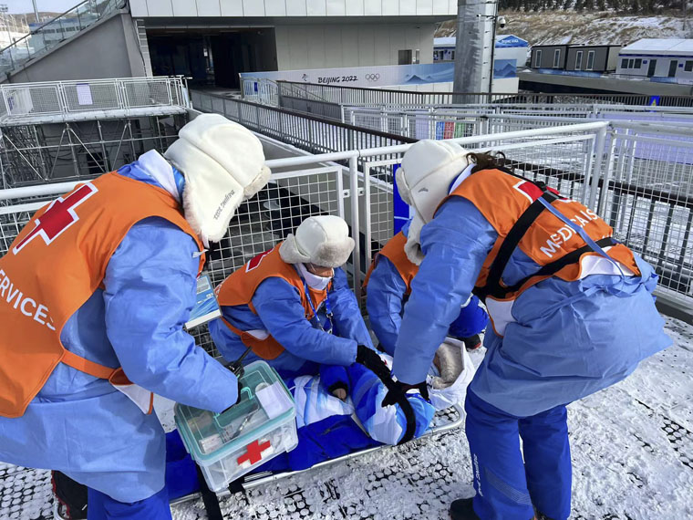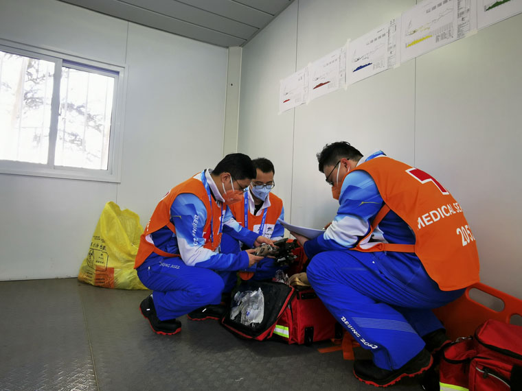 我们的工作分为两班,何宏涛副院长作为医疗官负责指挥与调度,一组队员负责在观众席巡诊,一组队员负责观众医疗站的诊疗工作。大家到岗后各司其职,进行检查、调试、消杀等。我们的保障任务一般都在傍晚,比赛刚开始的时候还是晴空万里、艳阳高照,一等太阳落山,气温就降到零下十几度,有些地面的冰雪没有完全融化,我们拎着巡诊箱、拿着手台、穿着厚厚的衣服,每一步都要小心翼翼地行走,每次巡诊回来手都是紫的。