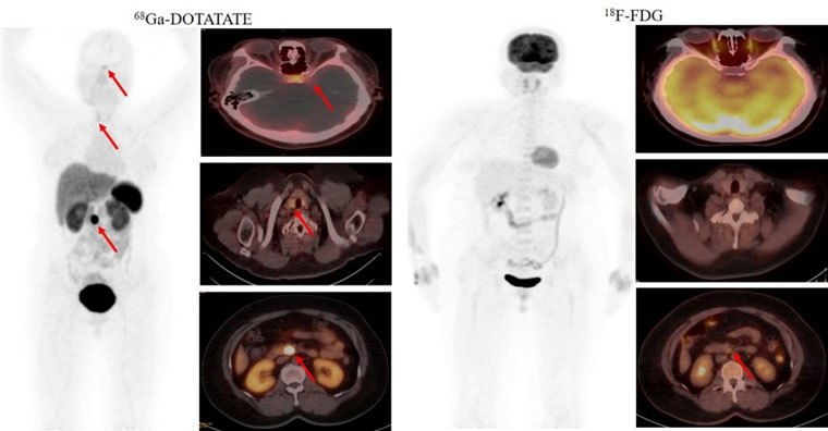 首个病例患者为一名49岁的女性,间断低血糖超过1年,甲状旁腺激素检查异常升高。脑MRI提示为脑垂体微腺瘤,上腹部MRI检查未发现明显异常。但临床怀疑胰腺存在病变,经新探针68Ga-DOTATATE PET/CT检查,发现了胰腺病灶,综合诊断多发性内分泌瘤病I型(MEN1型)。经胰腺穿刺病理证实为神经内分泌肿瘤G2。68Ga-DOTATATE及18F-FDG PET/CT双核素的检查结果为患者临床精准诊疗提供了胰腺病灶的影像学证据。