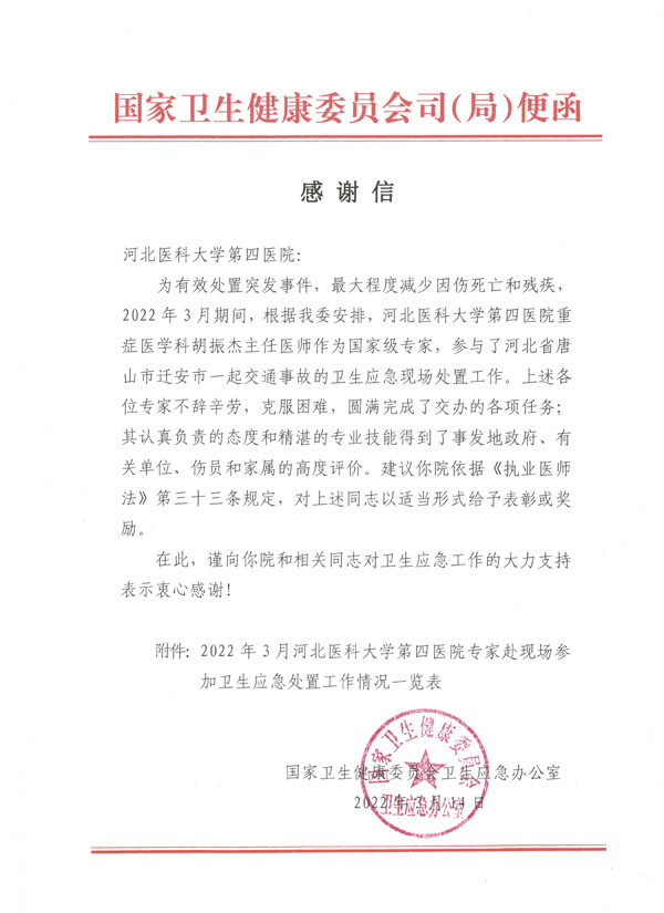 重症医学科胡振杰主任作为国家级专家赴唐山市迁安市对一起交通事故进行卫生应急现场处置工作,并圆满完成了上级交办的各项任务。他认真负责的态度和精湛的专业技能得到了当地政府、有关单位、伤员和家属的高度评价,展现了果冻传媒