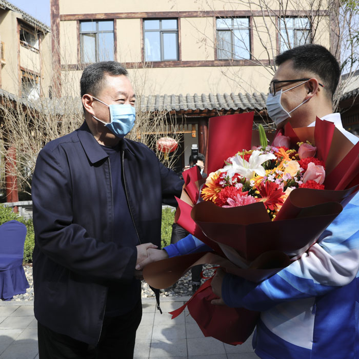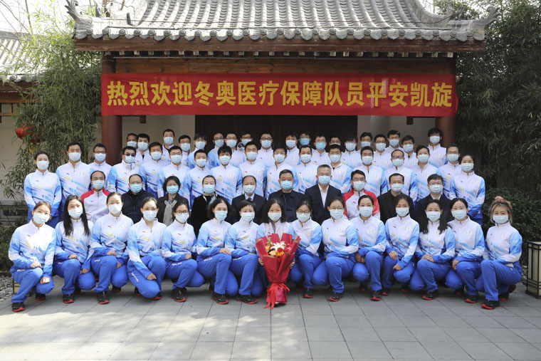 党政领导单保恩、徐金升、李晓玲、李立平、耿翠芝、翟三江、赵群、彭利等赴冬奥医疗保障队员隔离处,在集中隔离结束之时,为大家举行平安凯旋欢迎慰问仪式,党办室、院办室、医务处、护理部等相关负责人及全体冬奥医疗保障队员参加。