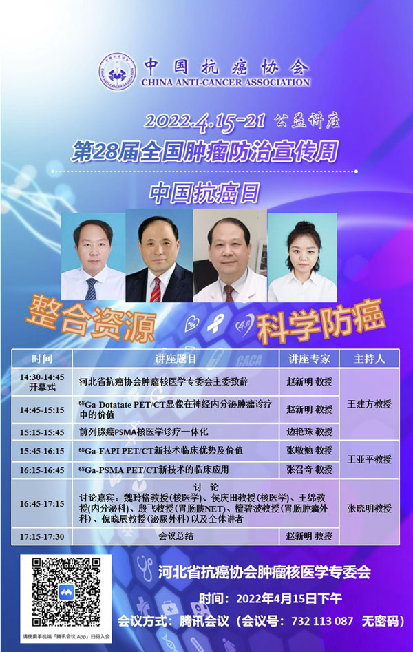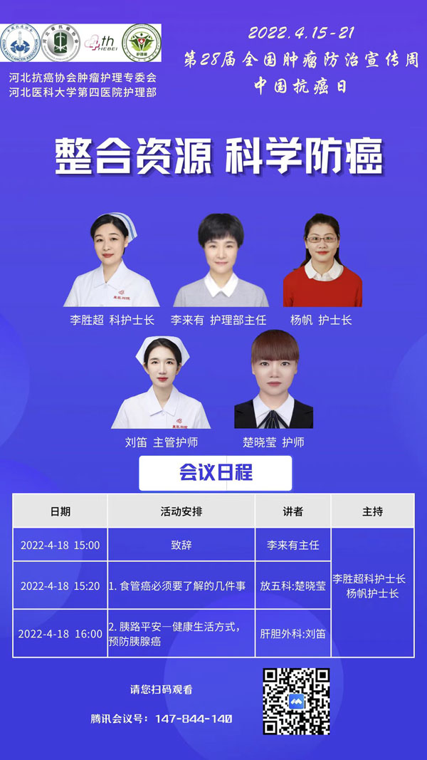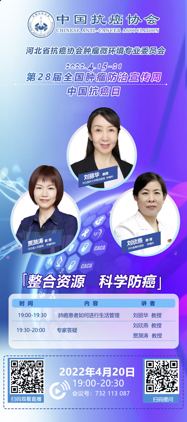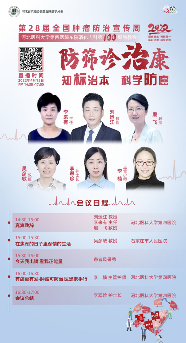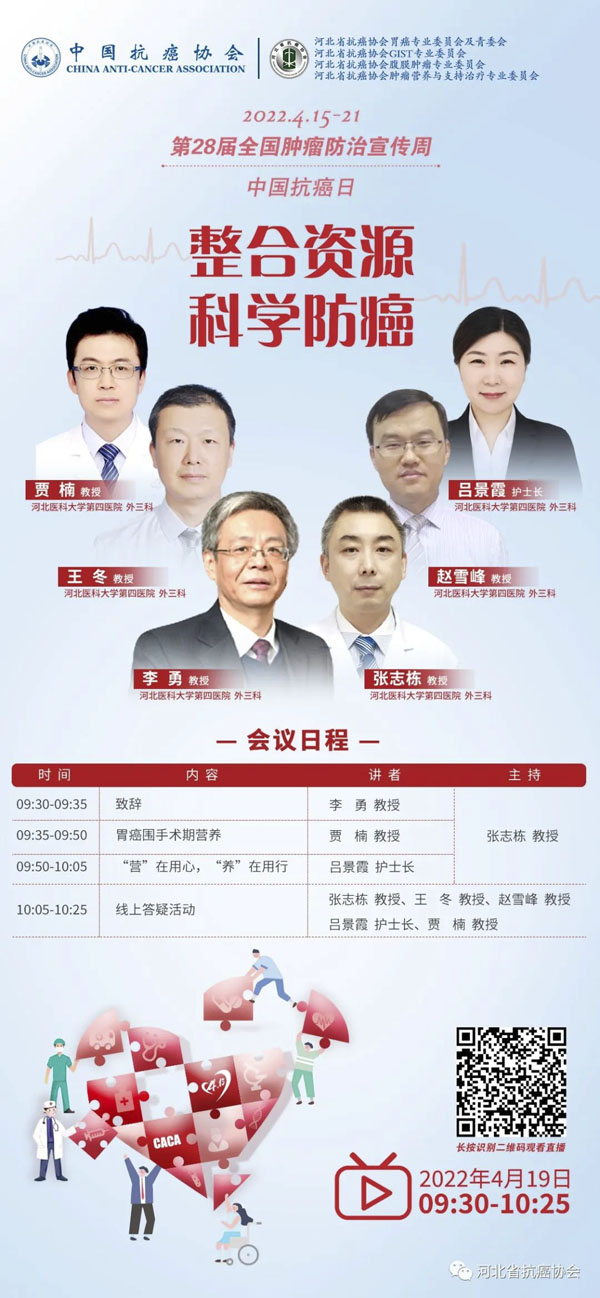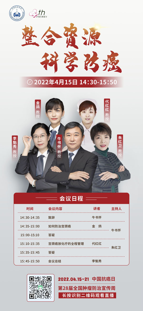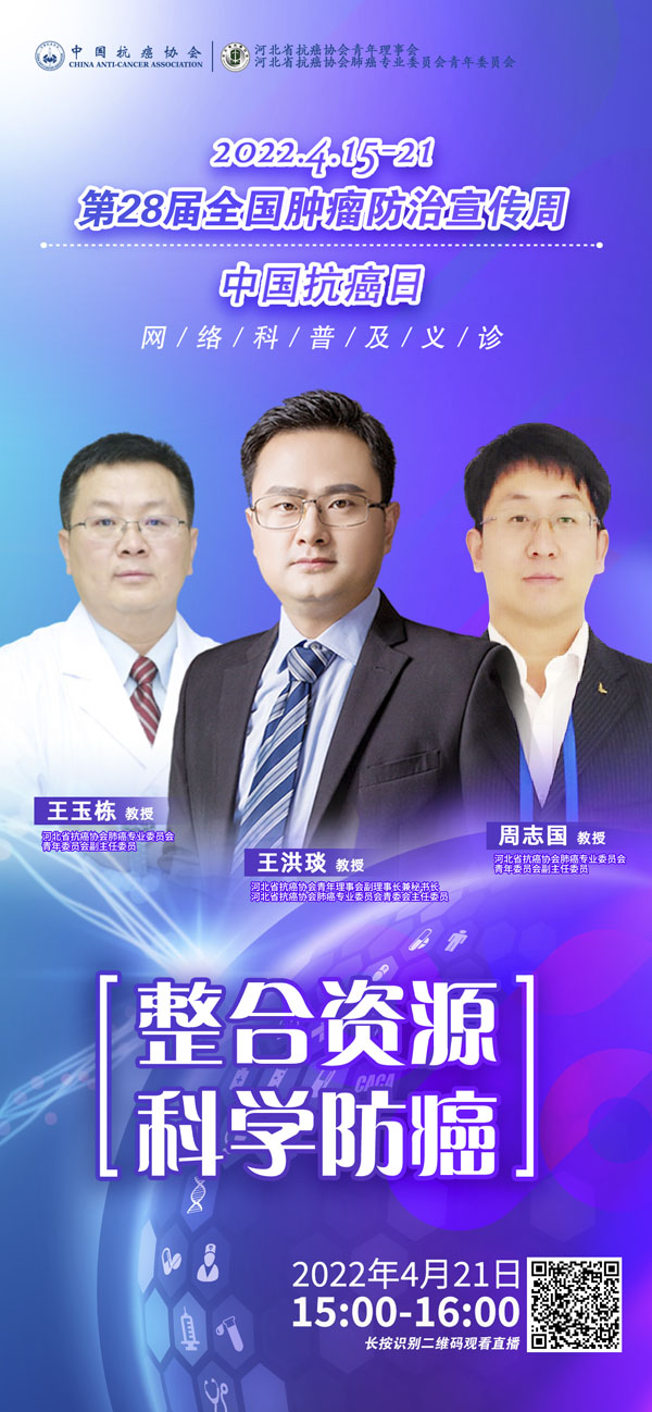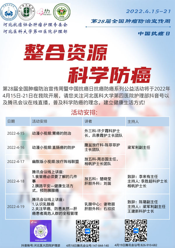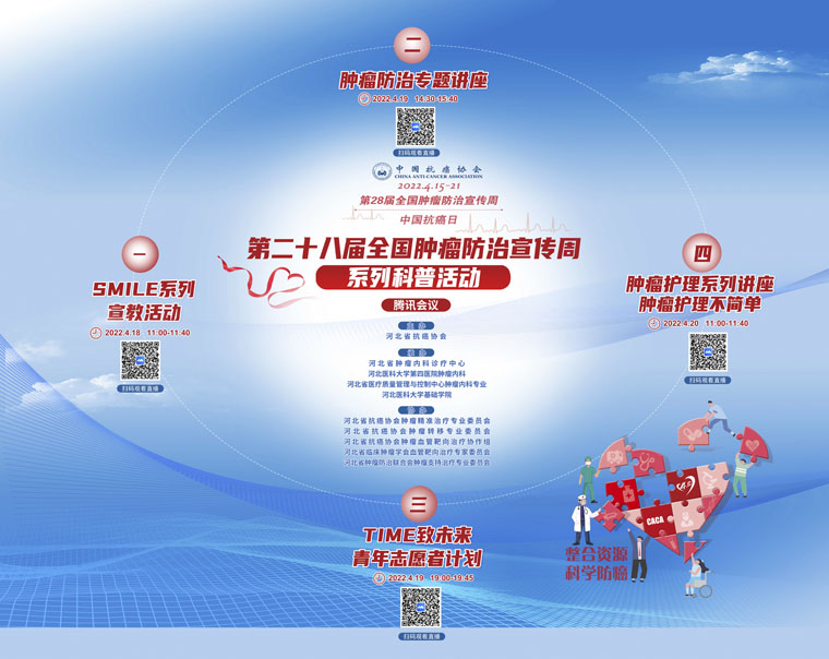 4月15-21日是我国第28个全国肿瘤防治宣传周,今年宣传周主题是“整合资源 科学防癌”。为贯彻落实健康中国癌症防治行动,进一步提高全社会癌症防控意识,营造全民防癌抗癌的良好氛围。由河北省抗癌协会、河北省肿瘤防治办公室主办的第28届全国肿瘤防治宣传周/中国抗癌日,河北省启动仪式将于2022年4月15日在保定正式启动。