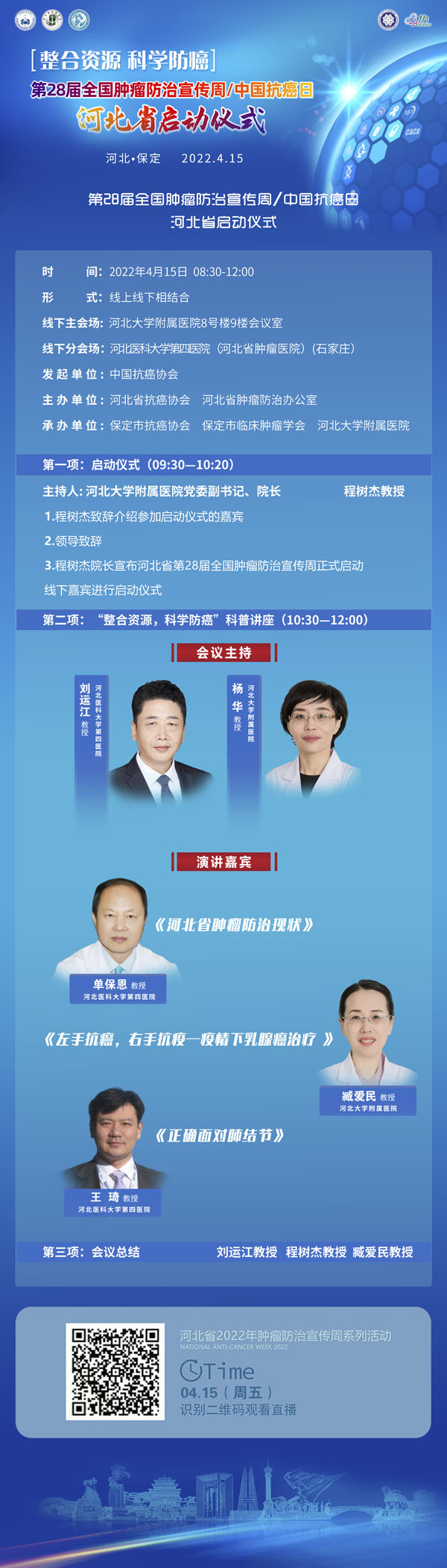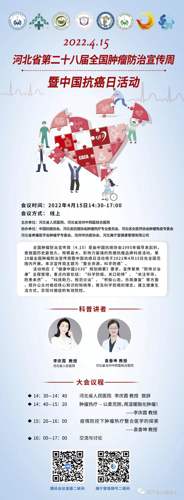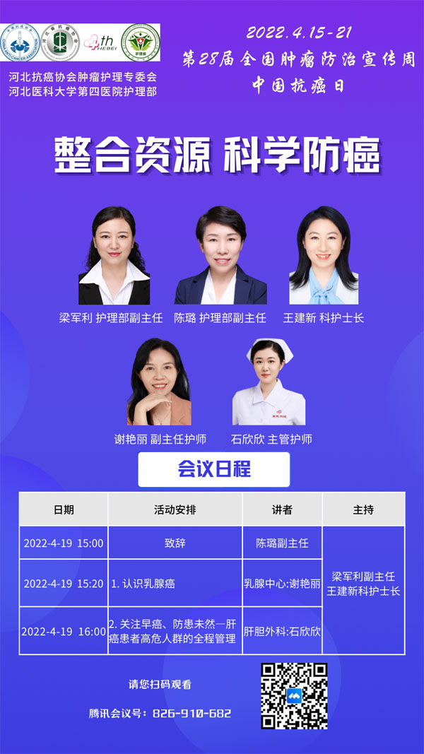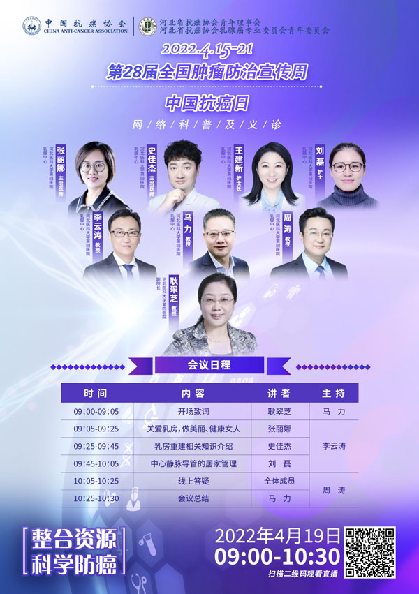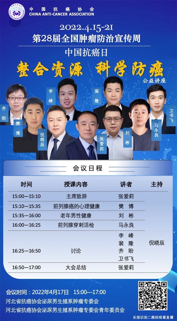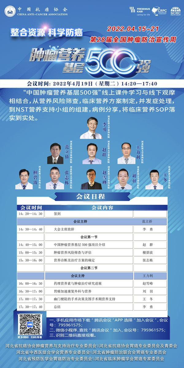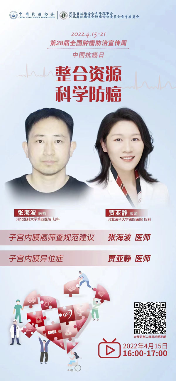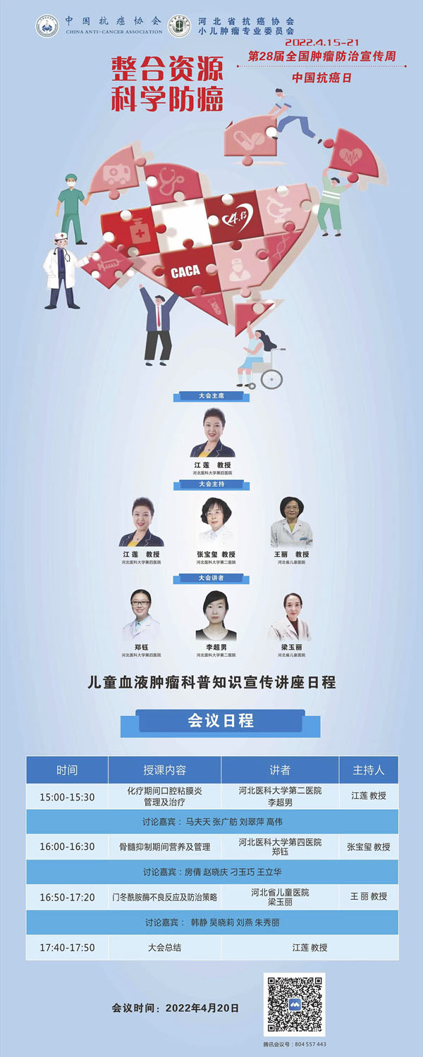 4月15-21日是我国第28个全国肿瘤防治宣传周,今年宣传周主题是“整合资源 科学防癌”。为贯彻落实健康中国癌症防治行动,进一步提高全社会癌症防控意识,营造全民防癌抗癌的良好氛围。由河北省抗癌协会、河北省肿瘤防治办公室主办的第28届全国肿瘤防治宣传周/中国抗癌日,河北省启动仪式将于2022年4月15日在保定正式启动。