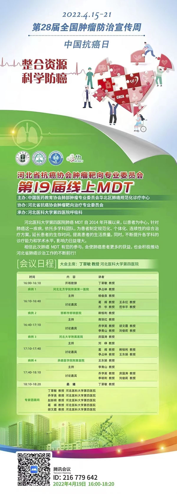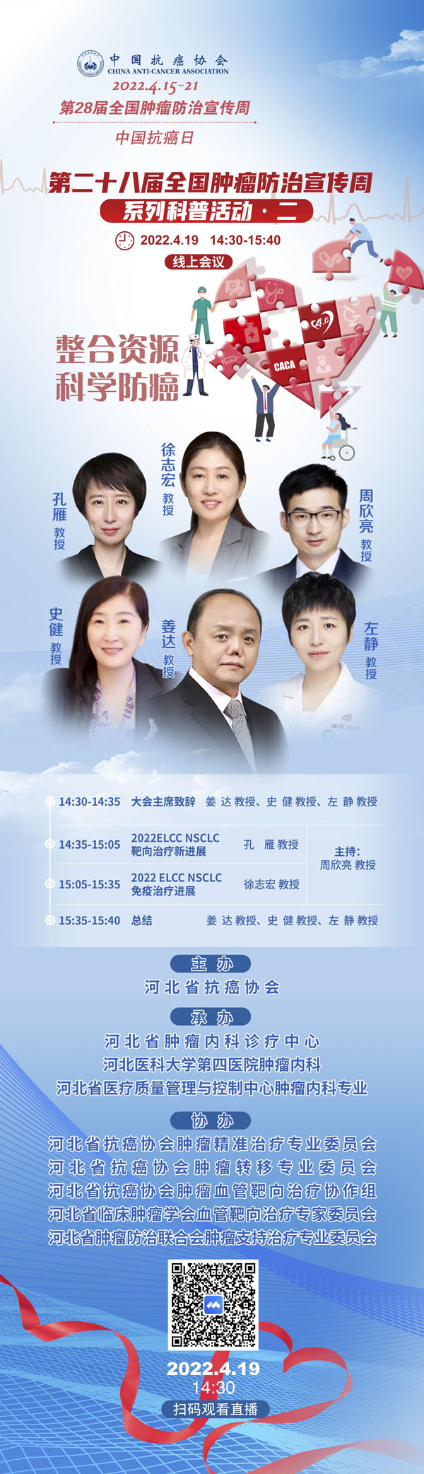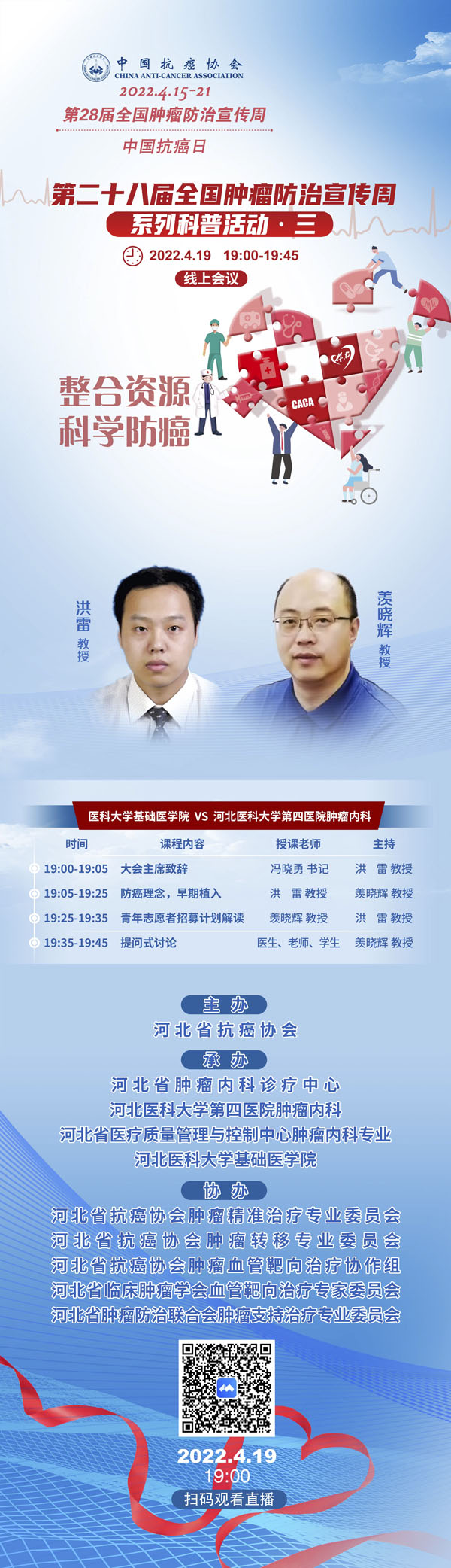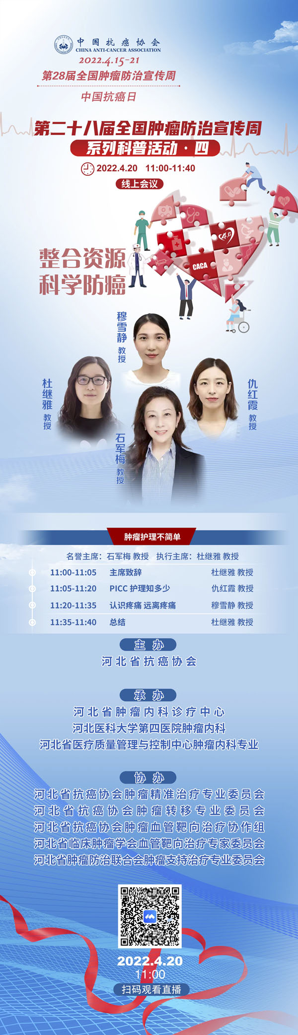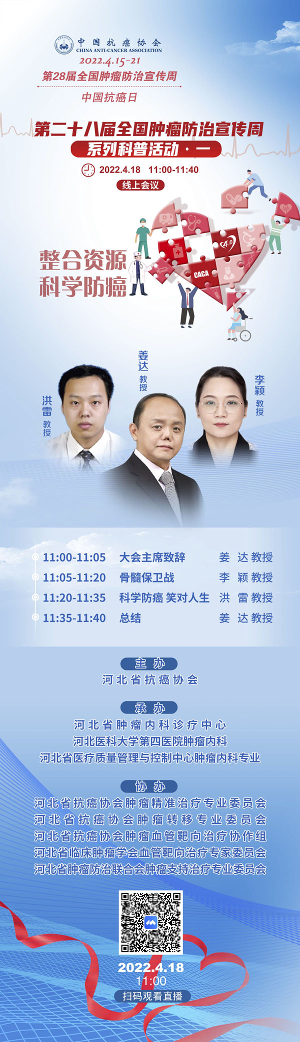 4月15-21日是我国第28个全国肿瘤防治宣传周,今年宣传周主题是“整合资源 科学防癌”。为贯彻落实健康中国癌症防治行动,进一步提高全社会癌症防控意识,营造全民防癌抗癌的良好氛围。由河北省抗癌协会、河北省肿瘤防治办公室主办的第28届全国肿瘤防治宣传周/中国抗癌日,河北省启动仪式将于2022年4月15日在保定正式启动。