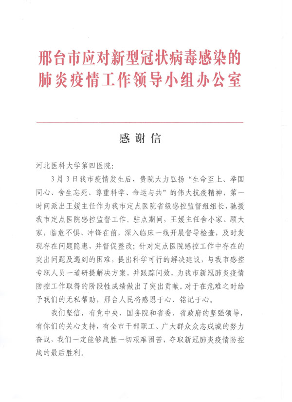 在面对突发疫情下过硬的院感防控能力,得到了邢台市卫健委的高度赞扬与认可。王媛表示,“作为一名从事医院感染防控的工作者,理应随时准备冲锋在前,这就是我的职责、使命。心怀阳光、不畏严寒,我将随时准备出发,为取得新冠疫情防控的最后胜利而不懈努力。”
