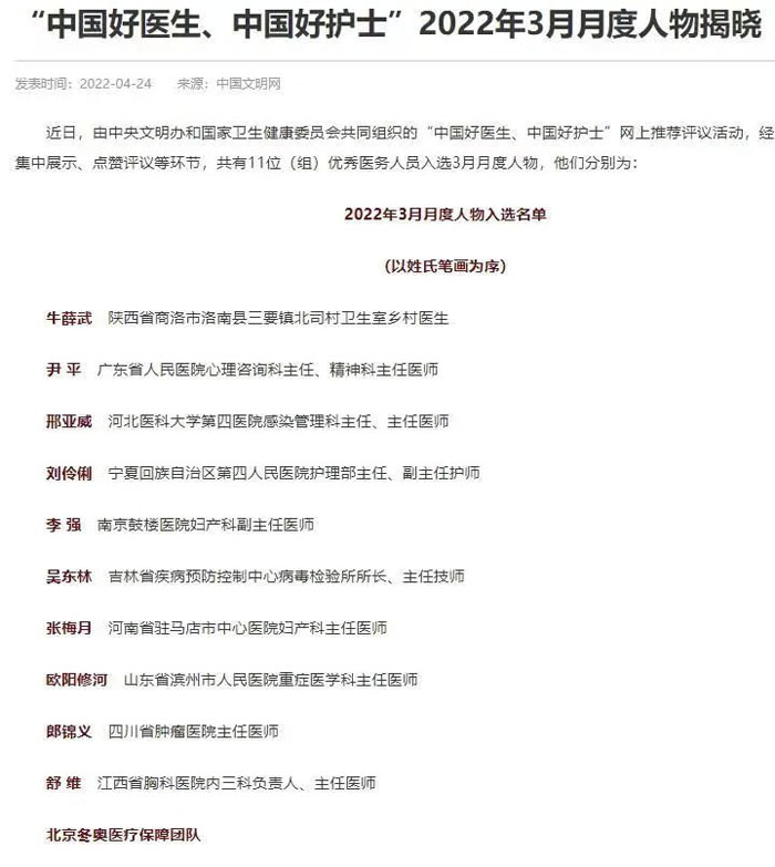 近日,由中央文明办和国家卫生健康委员会共同组织的“中国好医生、中国好护士”网上推荐评议活动3月月度人物揭晓,共有11位(组)优秀医务人员入选,河北省医院感染质量管理与控制中心主任、果冻传媒