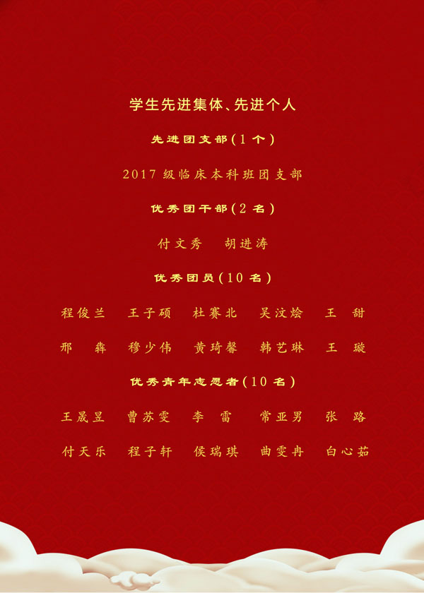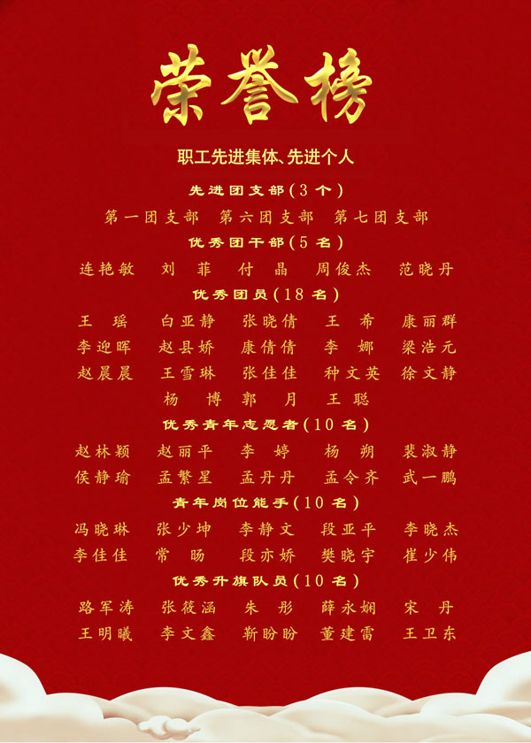在中国共青团成立100周年之际,近日,院团委作出表彰决定,对第一团支部等4个“先进团支部”、连艳敏等7名“优秀团干部”、王瑶等28名“优秀团员”、赵林颖等20名“优秀青年志愿者”、冯晓琳等10名“青年岗位能手”、路军涛等10名“优秀升旗队员”进行表彰。
