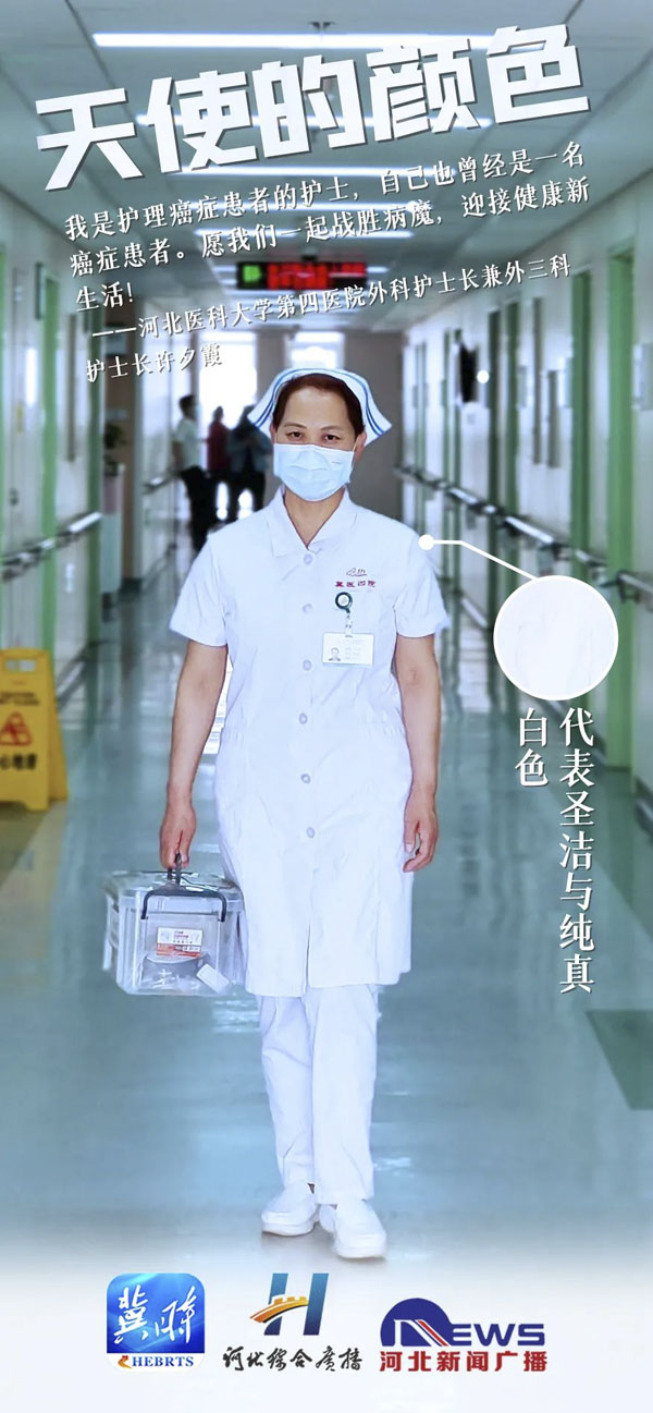 许夕霞护士长的事迹得到了省直媒体的广泛报道,5月10日,河北新闻广播推出专访及专题微信《天使的颜色|温暖肿瘤病患的白衣天使》,5月11日,冀时客户端、河北新闻广播微信小程序推出全媒体直播《天使的颜色》。