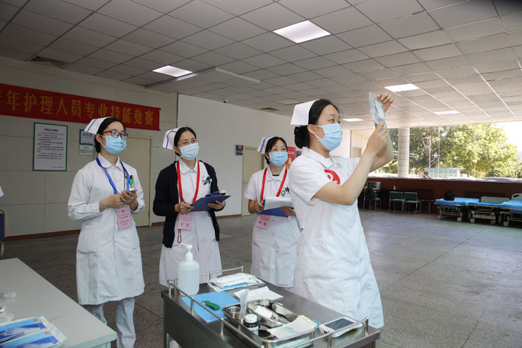 比赛当日,88名选手参加单项个人赛,其中本部55人,东院33人。考核以“赛道式”进行,涉及静脉留置针输液、心肺复苏+抢救药拿取、穿脱防护服+咽拭子采集等项目。选手抽取案例题,依照题目限时完成评估患者、准备用物、实施操作、理论答题等环节。赛场上,各位年轻的选手动作娴熟,通过扎实的专业知识认真回答了评委的提问。