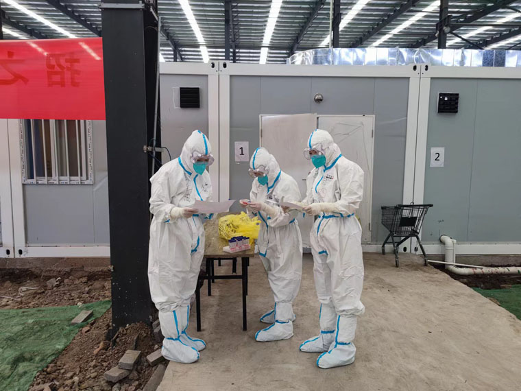 王嵩(左一)在方舱医院进行采集核酸前的准备工作