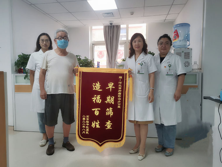 内镜室进行结直肠镜筛查,内镜室专家发现一例“结直肠早癌”患者,取活检送病理后,诊断为“灶性腺上皮重度异性增生”。河北省肿瘤防治办公室副主任贺宇彤将患者的情况反馈给外二科周超熙副主任医师,使患者得到了及时有效的治疗,术后病理分期为Ⅰ期。这对患者来说,既缓解了经济压力,又提高了生活质量。患者家属带上写有“早期筛查,造福百姓”的锦旗,送到河北省肿瘤防治办公室表达感谢。