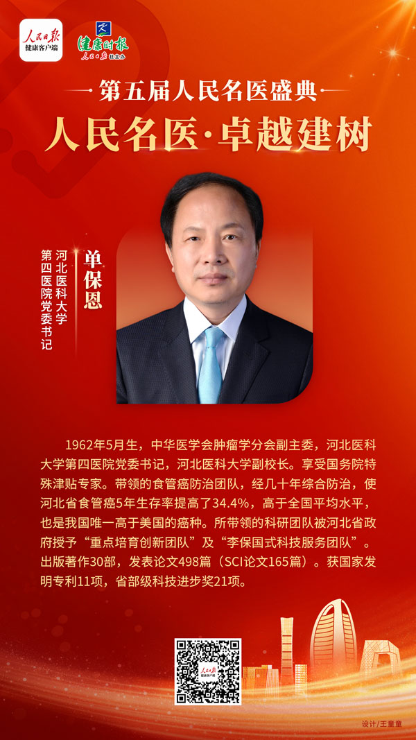 党委书记单保恩教授入选“第五届人民名医·卓越建树”。榜单囊括了全国117个学科(含亚学科或重大疾病组)的296名优秀代表,旨在展示临床工作突出、科研贡献显著、患者口碑良好的医生群体。