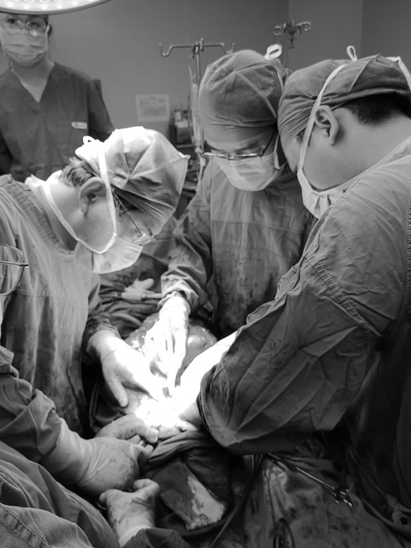 东院区泌尿外科就诊住院。检查显示,其腹部肿瘤巨大,占据整个腹腔右侧,且阴囊也有肿物侵入。手术当天,东院手术室护士李伟、王佳佳与泌尿外科师长进副主任医师团队及麻醉医生李伟靖、张子文积极沟通手术体位,决定给予右侧整体垫高、左侧安全固定、阴囊下方托起的改良侧卧位进行手术,以便暴露术野。术中,师长进副主任医师探查发现肿物呈肉瘤改变,与横结肠、升结肠、腰大肌等粘连严重,并整体包裹右侧输尿管。同时,因肿瘤巨大,患者肝脏、右侧肾脏被挤压,解剖位置发生较大改变,给游离肿瘤带来很大困难。师长进副主任医师带领王延超主治医师、未跃跃住院医师、崔煌甲医师、刘霏医师等人耐心操作,循序渐进。
