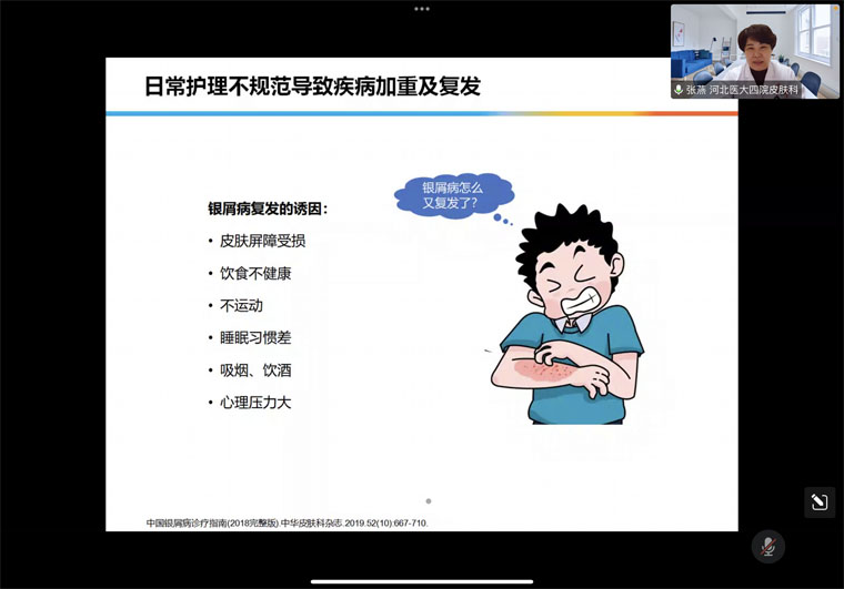 皮肤科于线上举办银屑病患教活动,科室负责人张燕教授以《做聪明的银屑病患者》为题分享治疗经验,受到了患者一致好评。