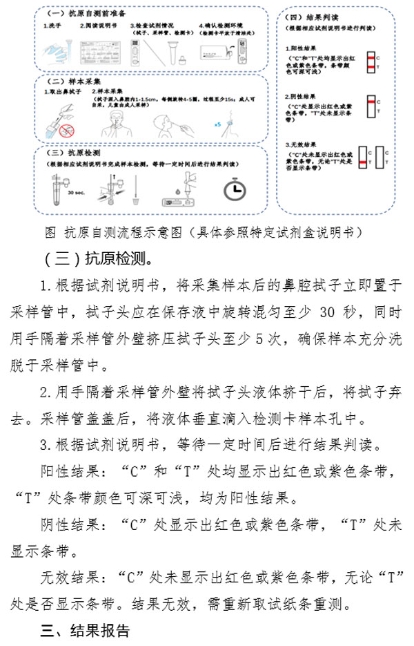 (三)注意事项。此类人员可以按照说明书示意的要求和流程进行抗原检测和结果判读,也可以向所在机构提出申请,在机构指派人员指导下进行抗原检测。
