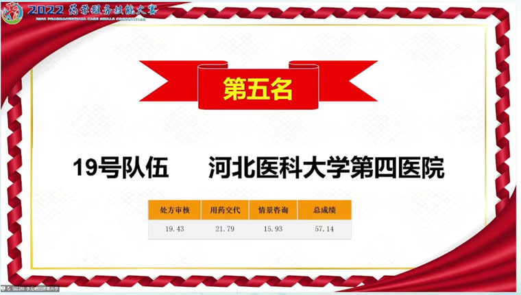 参赛人员由冯锐副主任带队,两位药师凭借扎实的专业知识、良好的沟通技巧,获得评委的一致认可,最终以57.14分的总成绩获得二等奖,排名全国第五,第一名由北京协和医院(59.93分)取得。