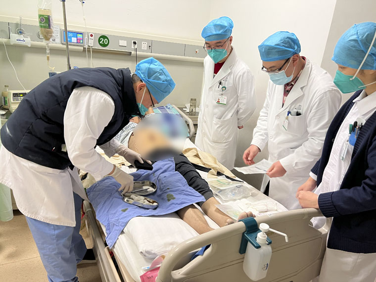 胸二科医生认真、仔细查房,询问患者情况,检查患者手术伤口。