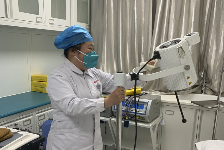 春节期间,皮肤科医护人员为患者进行红光治疗。