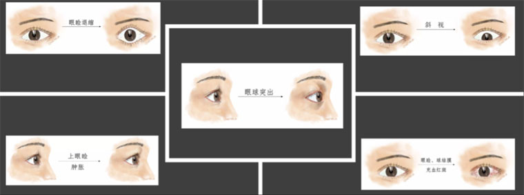 甲状腺相关眼病典型的眼部症状和体征:眼睑退缩、眼球突出、斜视、复视、结膜水肿等,严重者可引起视力下降等。
