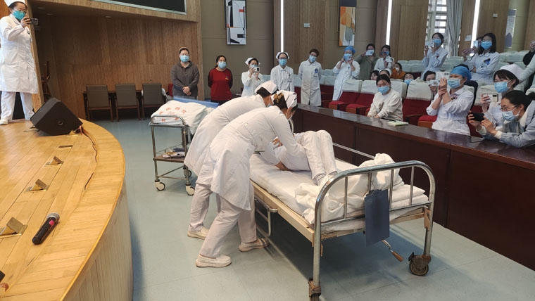 皮肤管理学组培训分为理论授课和工作坊两部分。理论授课内容围绕“重症患者常见皮肤问题”“压力性损伤概述及预防”开展。在工作坊环节,陈晓娜护士长和张书颖护士长演示了翻身的流程及注意事项,大家积极围观并讨论总结临床减压的方法,互相借鉴,学以致用。