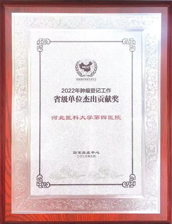 荣获国家癌症中心颁发的“2022年度肿瘤登记工作省级单位杰出贡献奖”。