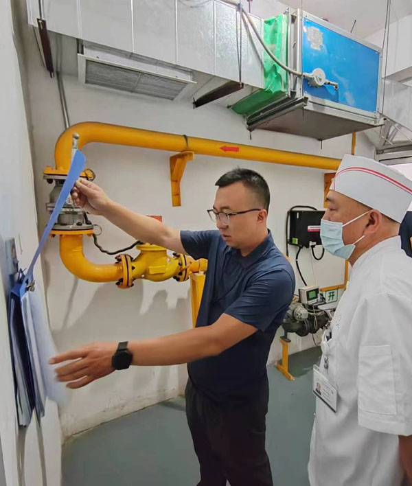 检查组一行先后到南楼制氧机房的燃气锅炉房、污水站、新医技病房楼负一膳食部进行排查,查看规章制度与安全警示标牌、燃气检漏、应急设施状态、锅炉房内安全和消防设施设备配备、食堂燃气安全管理等,并对涉及有限空间作业标识设置、作业审批、安全交底和防护救援设备等情况详细检查。