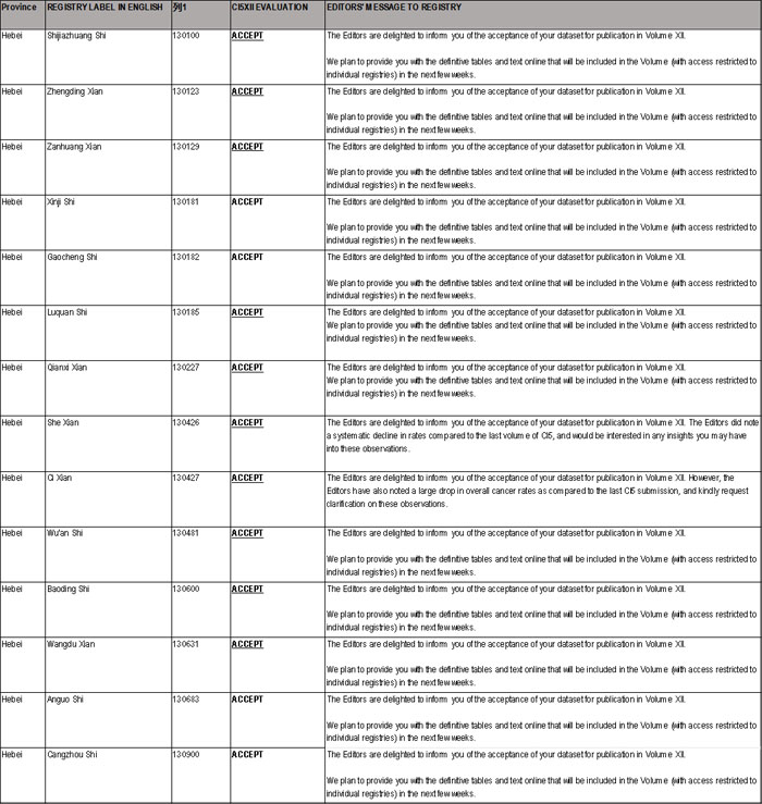 河北省14个肿瘤登记处分别是磁县、涉县、保定市区、迁西县、武安市、赞皇县、沧州市区、石家庄市区、辛集市、安国市、望都县、藁城区、鹿泉区、正定县,覆盖人口约1000万人。本次肿瘤数据被国际癌症研究机构(IARC)收录,表明我省肿瘤数据质量达到国际标准,得到国际专家认可,这对我省今后肿瘤登记工作的开展起到很大的推动作用。