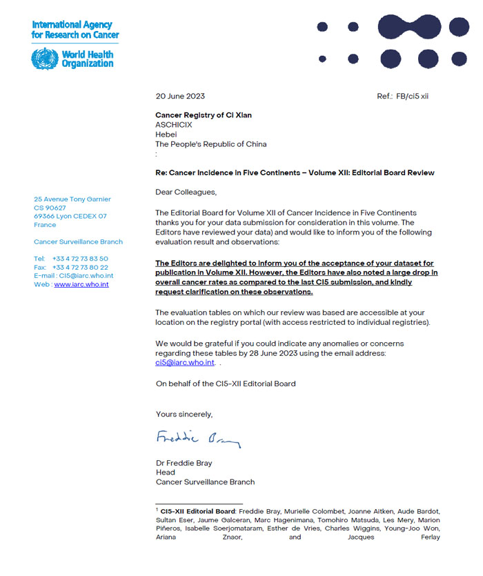 世界卫生组织(WHO)所属的国际癌症研究机构(IARC)是世界上权威的癌症研究机构。《五大洲癌症发病率》作为国际癌症研究机构出版的专著,向全球发布癌症流行现状及趋势的权威数据。自1966年开始发布第1卷,每5年发布一次,迄今已发布11卷,其中我省磁县相继被第8、10和11卷收录,涉县被第11卷收录。