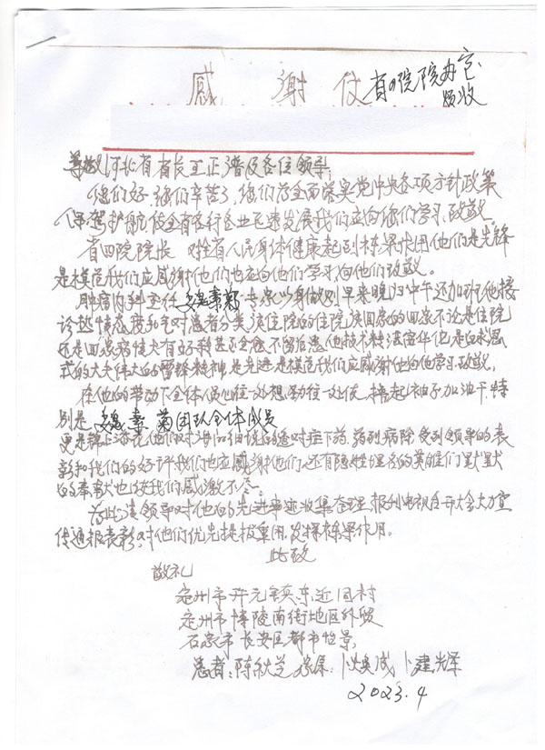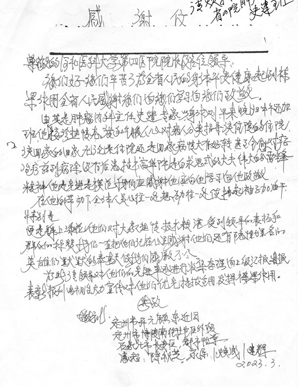 收到一名"特殊"患者的感谢信,该信得到河北省政府、河北省教育厅及河北医科大学领导的批示,字里行间对肿瘤内科史健教授、魏素菊教授、董倩副教授、孔雁副教授热心周到的诊疗服务及科室全员积极向上的精神风貌表示连连称赞。在医院党委的正确领导下,肿瘤内科深入贯彻“大健康”理念,全方位全周期守护患者群众的生命健康,以实际行动推动医院高质量发展。