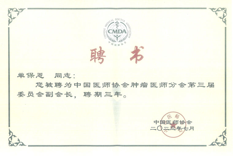 党委书记单保恩教授当选中国医师协会肿瘤医师分会第三届委员会副会长。单保恩教授还担任中华医学会肿瘤学分会副主任委员、中国抗癌协会党委委员,是河北省卫生健康领域少有的在多个国家级学会任副主委及以上职务的专家,充分体现了国内专家同道对他多年来取得系列研究硕果的高度肯定,也彰显了果冻传媒