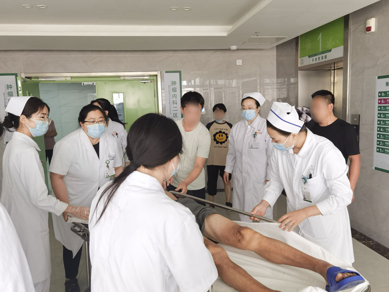 8月16日下午,忙碌的肿瘤内科如往常一样,各项医疗工作紧张有序进行。“哐当!”伴随突然而来的推门声,八楼中厅办公室门口传来大喊“有人晕倒在电梯里面了!”话音未落,大家立即起身跑向电梯厅……