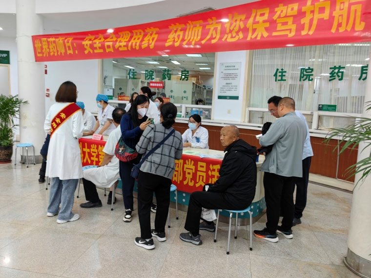 今年9月25日是第十五个世界药师日,主题为“药学:促进卫生系统健康发展”。当日上午,药学部在两院区门诊大厅举办“世界药师日”宣教义诊活动,由多名药师组成专家团队,为来院患者及家属提供专业的用药知识和指导,解答用药方面的各种疑问。针对今年世界药师日主题,现场发放合理用药知识宣传页,同时也贴心地提供量血压等服务,受到患者一致好评。本次活动也是第二十七、五十四党支部的一次主题党日活动。